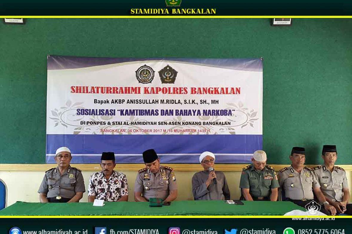 STAMIDIYA - alhamdiyah.ac.id : Kunjungan KAPOLRES Bangkalan ke Sekolah Tinggi Agama Islam Al-hamidiyah (STAMIDIYA) dalam rangka silaturrahim dengan menyampaikan sosialisasi "KAMTIBMAS DAN BAHAYA NARKOBA" jum'at(06-10-2017) diruang auditorium stamidya.